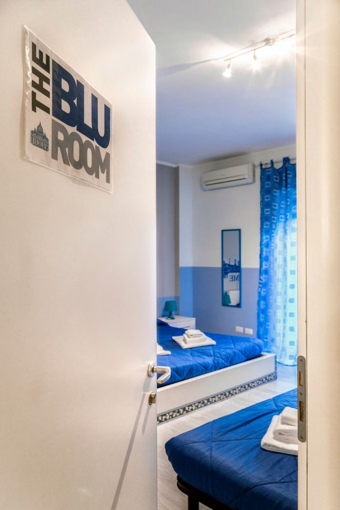La camera, intonata nel colore azzurro come il cielo di Roma, è ideale per tre persone, dispone di un letto matrimoniale e un letto singolo, bagno in camera, tv, aria condizionata,  wi-fi e un balcone con vista cupola di San Pietro.